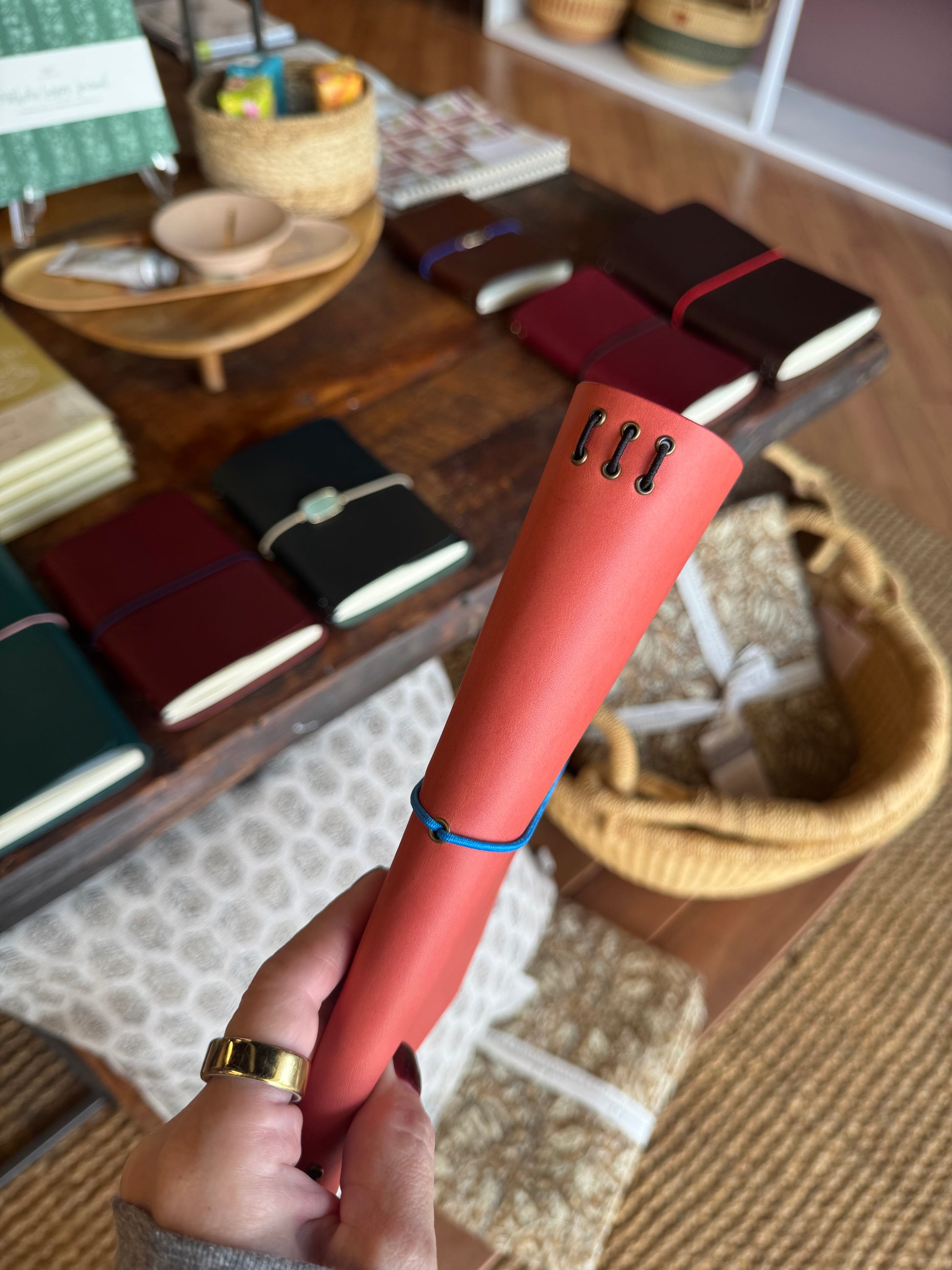Premium Italian vegetable-tanned leather trifold folio in A5 size. Every order is handmade and assembled with care. This beautiful leather will patina over time and mold to hug your journal inserts, creating a beautiful heirloom that will last you a lifetime. This timeless leather folio is refillable, durable, and designed for everyday creativity and productivity.